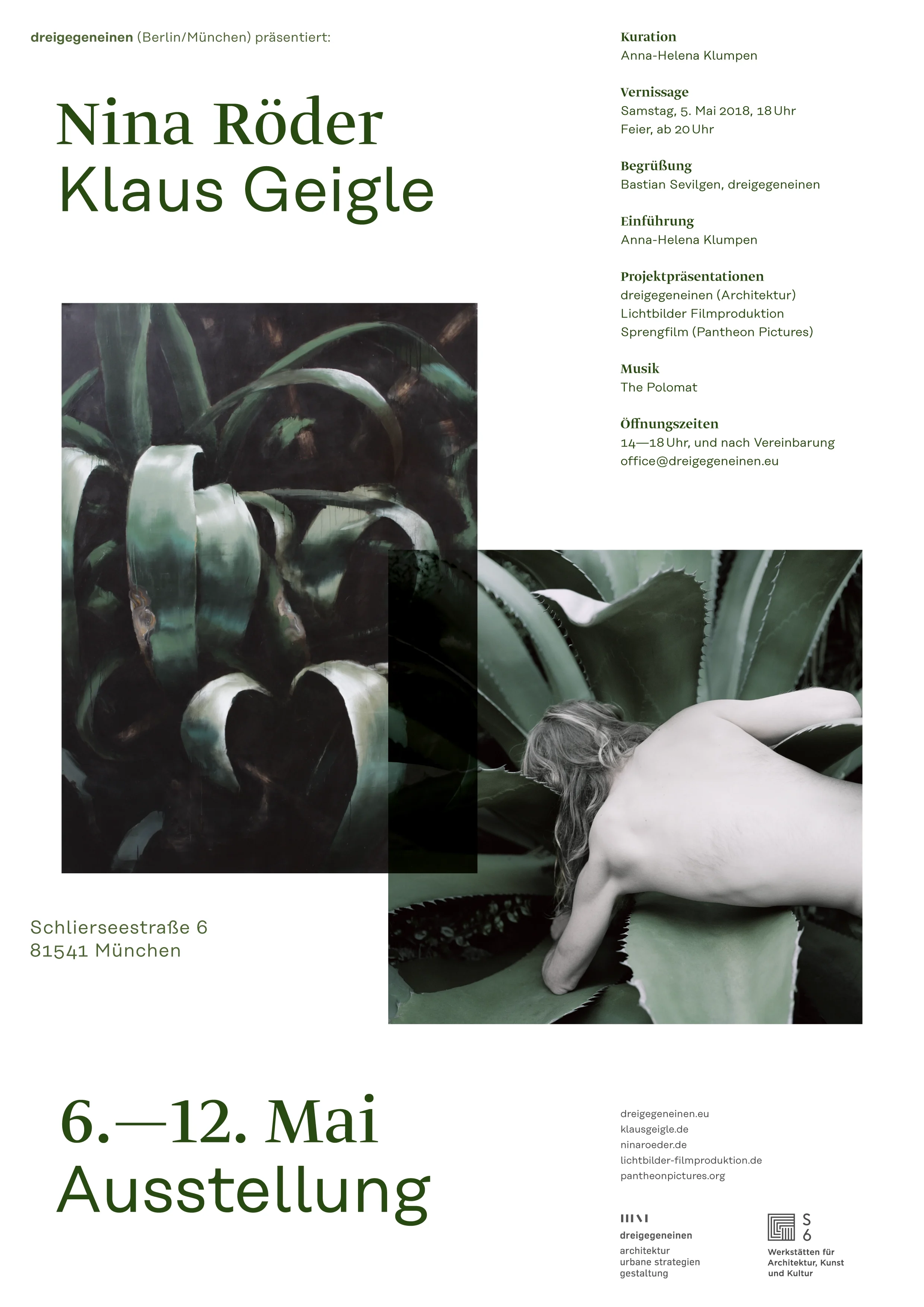 Anlässlich der Büroeinweihung des Architekturbüros dreigegeneinen in München Giesing wurden die neuen Arbeitsplätze temporär geräumt, um Raum für eine Ausstellung zu schaffen. Gezeigt wurde eine dialogische Gegenüberstellung ausgewählter Werke des Malers Klaus Geigle und der Fotokünstlerin Nina Röder.