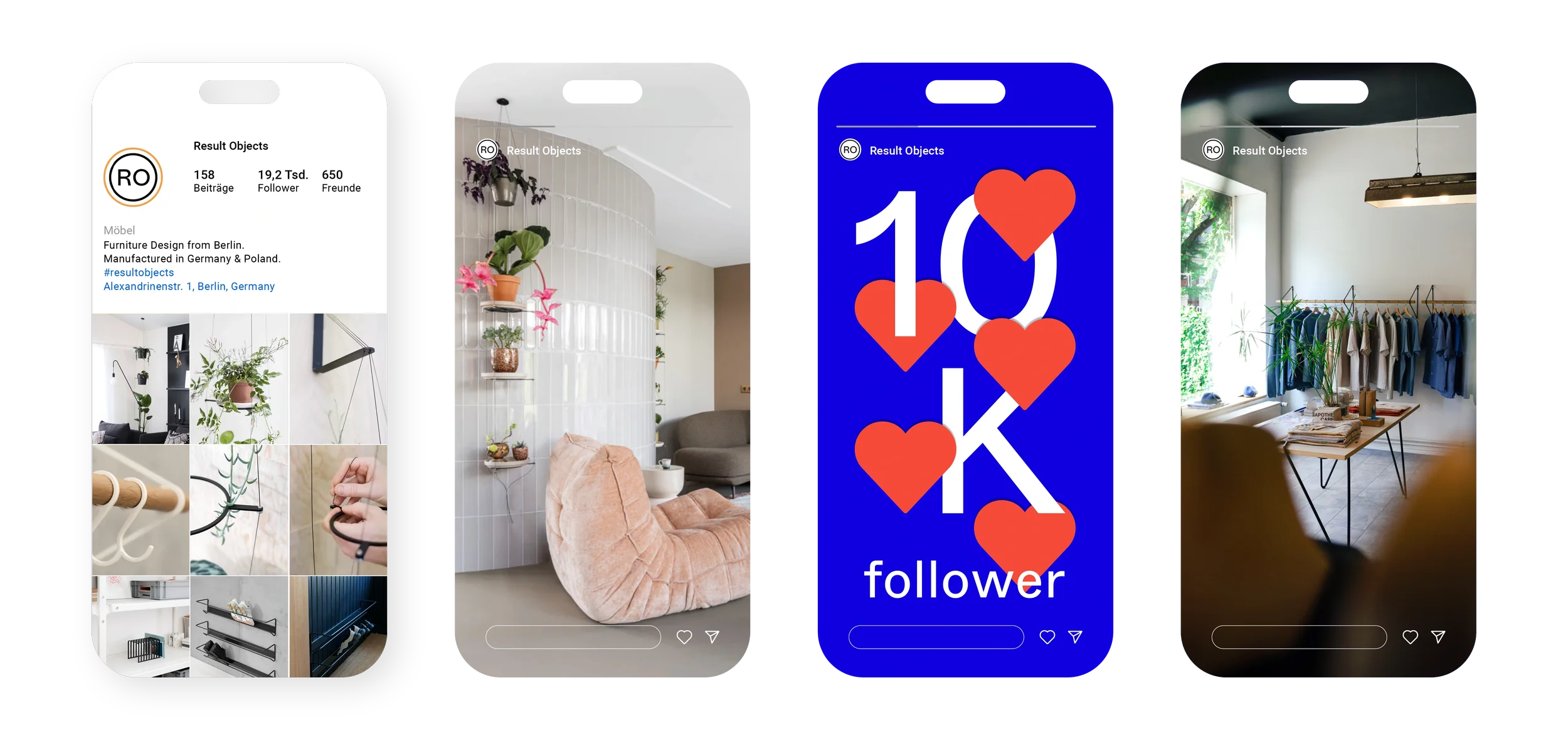 Den Instagram-Auftritt von Result Objects habe ich seit 2019 als Teil der Markenführung und Art Direction betreut. Mit knapp 19.000 Followern hat der Kanal eine treue, designaffine Community aufgebaut. Produktfotos, Inspirationsbilder, Anwendungsszenen und neue Produkte werden konsistent im visuellen Erscheinungsbild des Labels kommuniziert. Klare Bildsprache, reduzierte Ästhetik, authentische Inhalte – der Feed spiegelt direkt wider, wofür Result Objects steht.